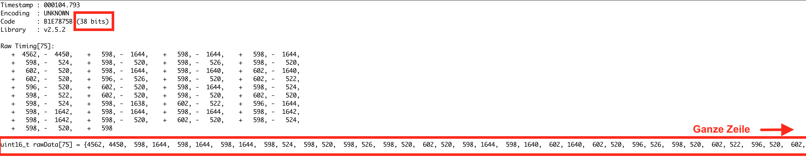 Passe die Zahlen entsprechend an. Die vordere Zahl entspricht der Zahl in der eckigen Klammer des rawData. Hier [75]. Die Zweite Zahl entpsricht den Bits. Diese findest du beim Auslesen der Fernbedienung hinter Code (siehe Bild oben)