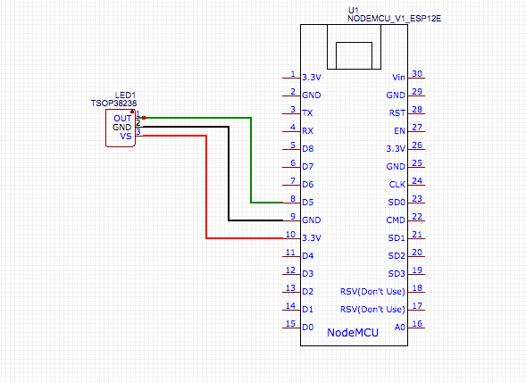 Damit wir später Signale senden können, die der Fernseher versteht, müssen wir zuerst einen IR Empfänger bauen, über den wir die Signale der Original Fernbedienung auslesen können. Hierzu benötigen wir lediglich den ESP8266 und den IR Empfänger TSOP.