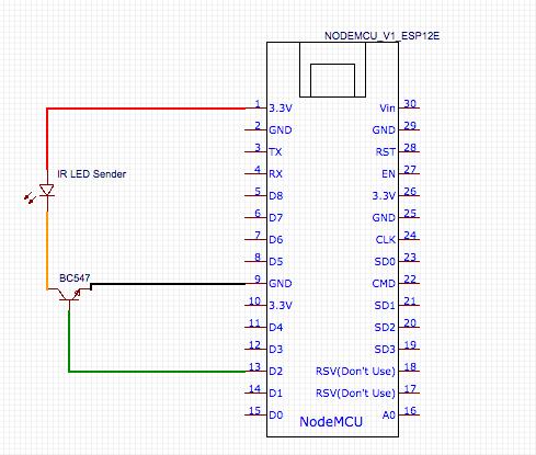 Sobald du den gewünschten Code der Fernbedienung herausgelesen hast, kann der NodeMCU zum Sender umgebaut werden. Hierzu benötigen wir die IR Sender LED und den Transmitter BC547. Diese werden wie im folgenden Schema beschrieben miteinander verbunden. Ein etwas anschaulicheres Bild findest du hier
