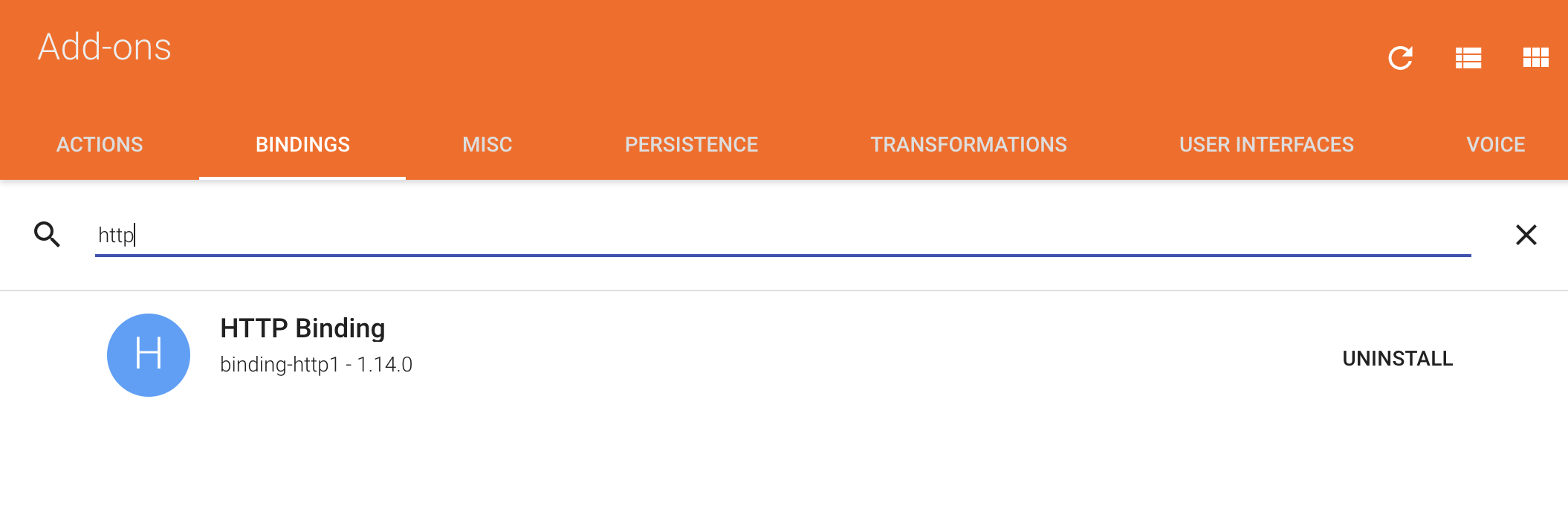 Damit das klappt, benötigst du das HTTP Binding. Das wird über die Paper UI installiert. Dazu navigierst du in der Paper UI auf Add-ons -> Bindings -> HTTP Binding und installierst es über den Install Button rechts.