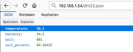 nodemcu.url ist die URL, die aufgerufen werden soll. Dort sollte dann entsprechend die JSON zu finden sein, wie im Screenshot zu sehen. Kleiner Tipp: Der Firefox Browser zeigt die Daten gleich formatiert an.