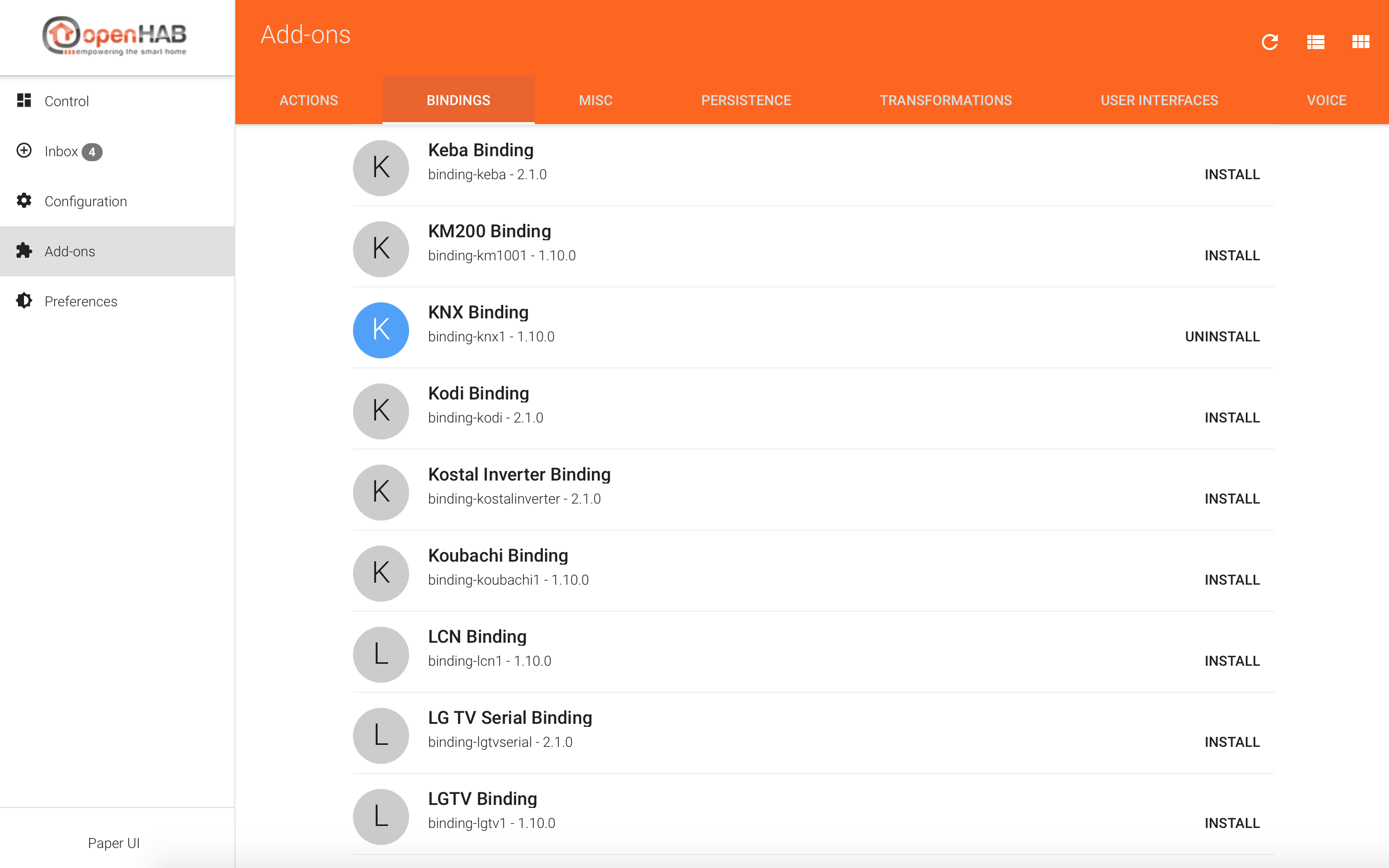 Im nächsten Schritt muss openHAB KNX beigebracht werden. Das geht über die Paper UI Ansicht recht einfach. Hierzu wird im Browser die Paper UI unter openhabianpi:8080/paperui aufgerufen. Über die Menüleiste wird der Punkt „Add-ons“ angewählt -> oben das Tab „Bindings“ anwählen und bis zu „KNX Binding“ herunterscrollen und rechts auf „Install“ klicken. Das Binding ist (leider) noch kein 2.1 Bindung. Das ist aber nicht weiter tragisch.