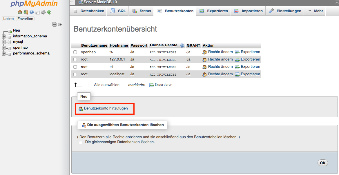 Nach dem Abspeichern ist dein Benutzer und deine Datenbank erstellt. In meinem Fall ist das:
