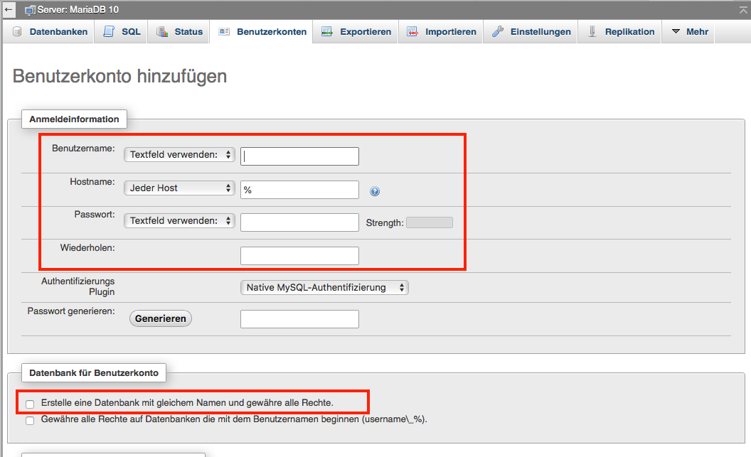 Zusätzlich setzt du ein Häkchen bei „Erstelle eine Datenbank mit gleichem Namen und gewähre alle Rechte“. Dadurch wird direkt eine Datenbank erstellt, auf die der oben angelegte Benutzer Zugriff hat.