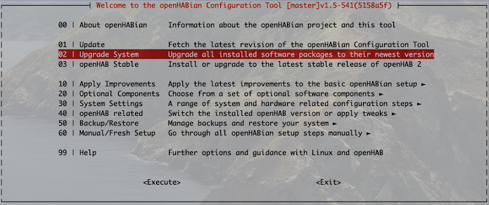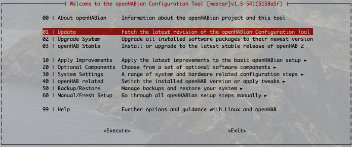 Du solltest nun in der Überschrift auch die neuste Version v.1.5 – xxx von openHABian sehen. Das ist die ganze Umgebung, in der openHAB installiert ist, wenn du es mit dem openHABian Image auf dem Raspberry installiert hast. Du kannst nun mit dem Punkt „Update“ fortfahren. Hier werden alle Paketlisten geupdated, damit später keine alte Version einer Komponente heruntergeladen wird.