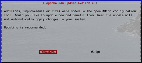 Damit öffnest du das Config Menü von openHAB. Wenn deine letzte Aktualisierung schon eine Weile her ist, kann es sein, dass du bereits auf Updates hingewiesen wirst. In diesem Fall das openHABian Update.